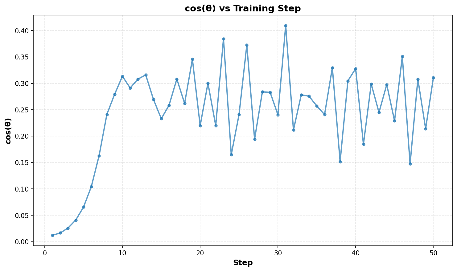 The key insight is that the incorrect assumption we have been making is that $a_i$ remains unaligned with the gradient. For simplicity, let’s assume that we are looking at a rank-1 LoRA, trained under SGD. While it is true that $a_i$ starts unaligned at the very beginning of training, within a few steps, $a_i$ will actually align to become very close to the top right singular vector of $G$!