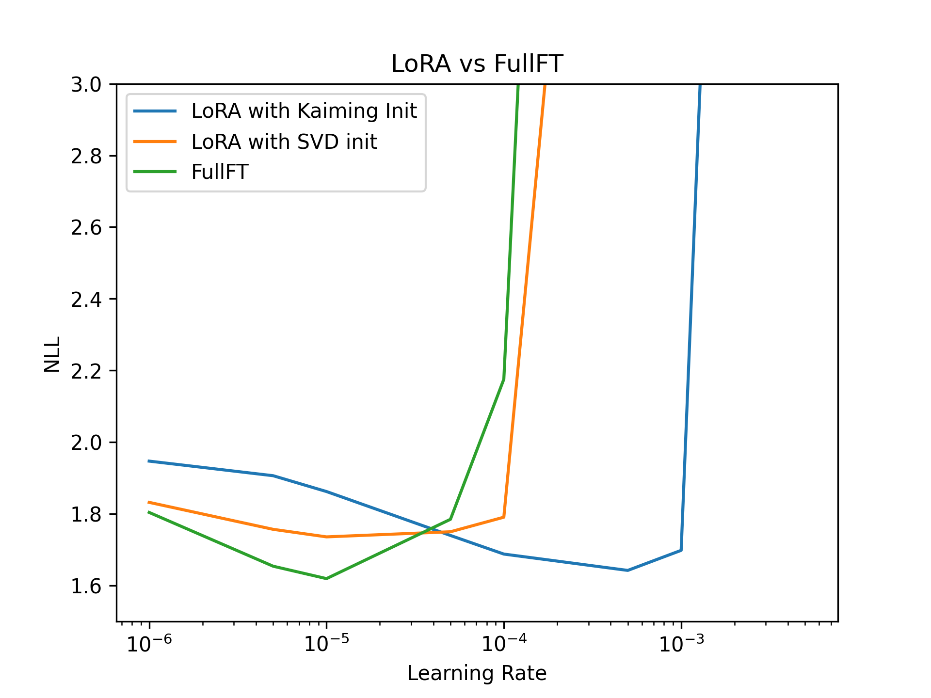 I compared this approach to standard Kaiming initialization and FullFT, using Adam as my optimizer and $\alpha=32$ to match the setting of Thinking Machine’s experiment. I’m training a rank-1 LoRA for Llama-3.2-3B on the Tulu-3 Dataset, and the full reproduction code can be found here. This is something of a reproduction of a result in some other papers that introduce the idea. This improved initialization results in optimal learning rates that match FullFT, suggesting that its early training dynamics are a better approximation of it!